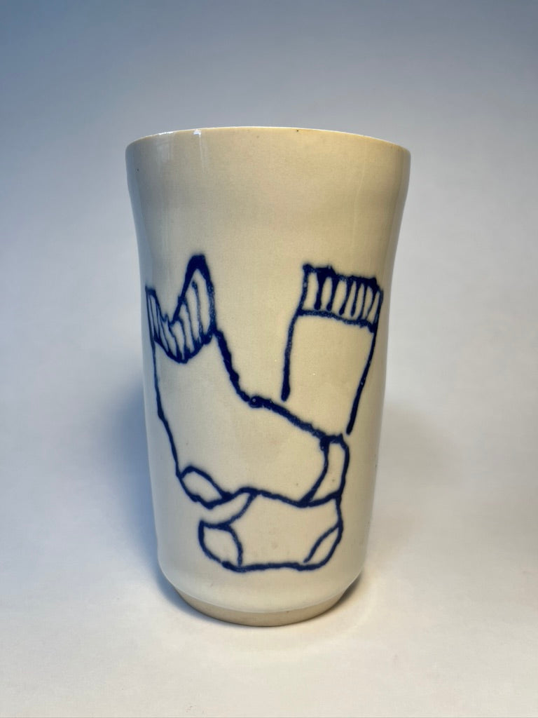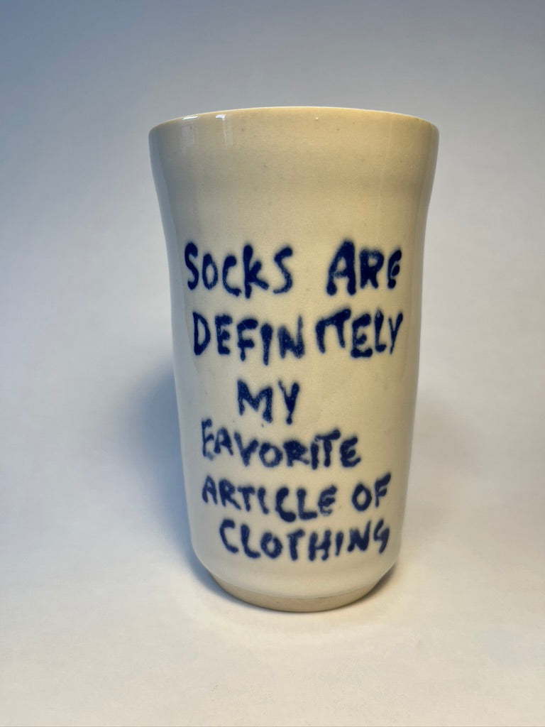 "Socks are my favorite article of clothing" tumbler. Glazed in a glossy white with detail in cobalt.