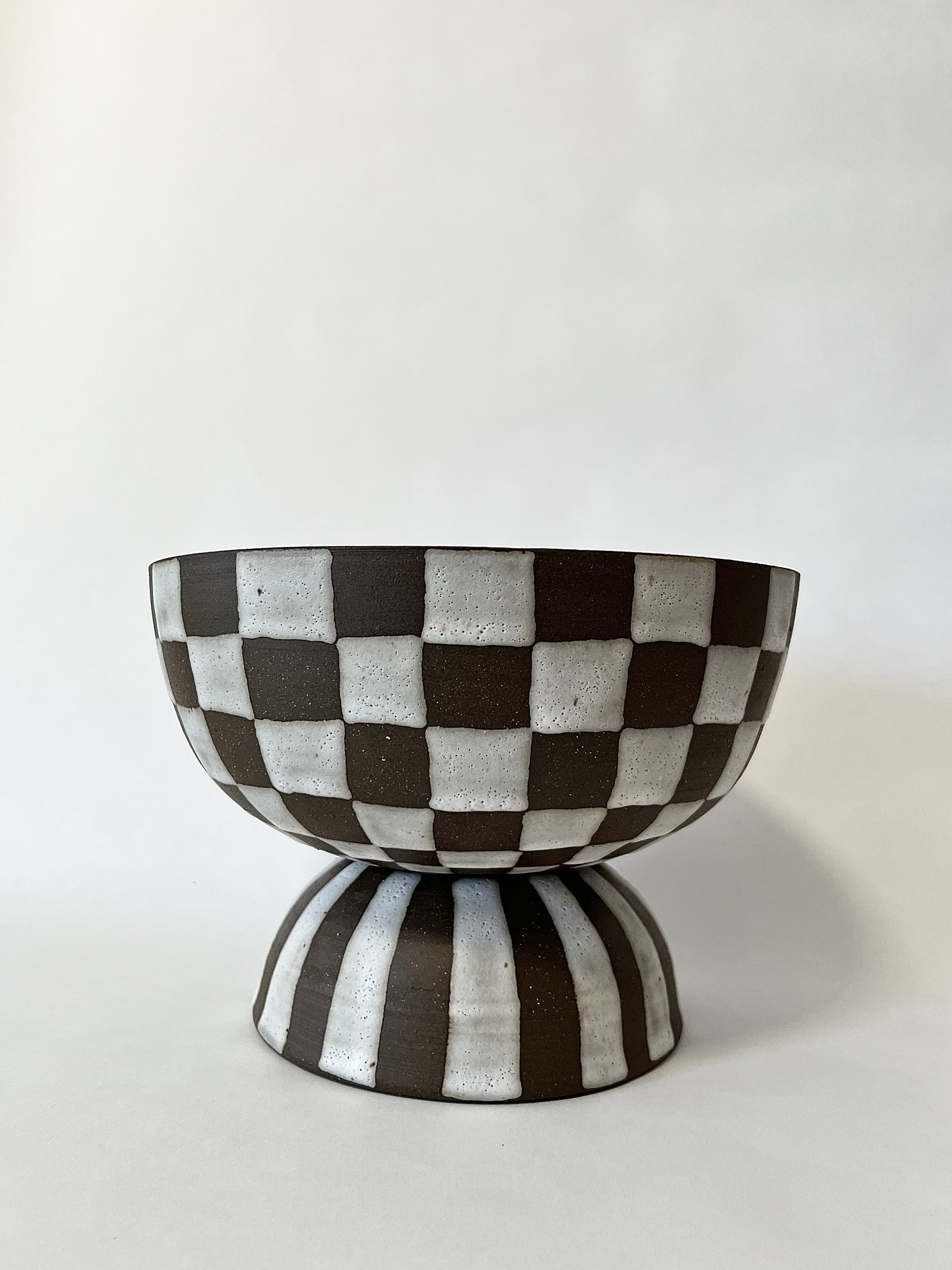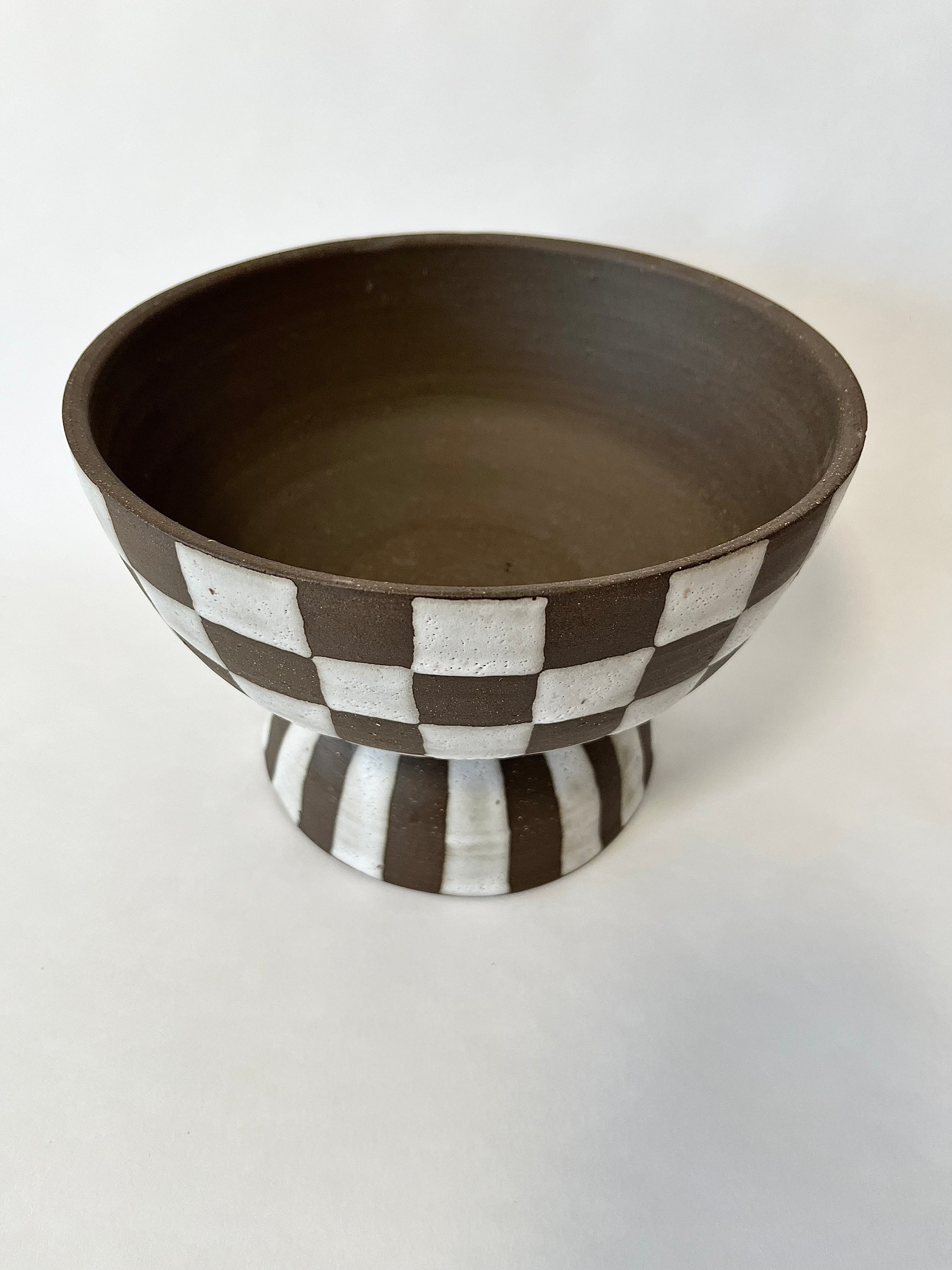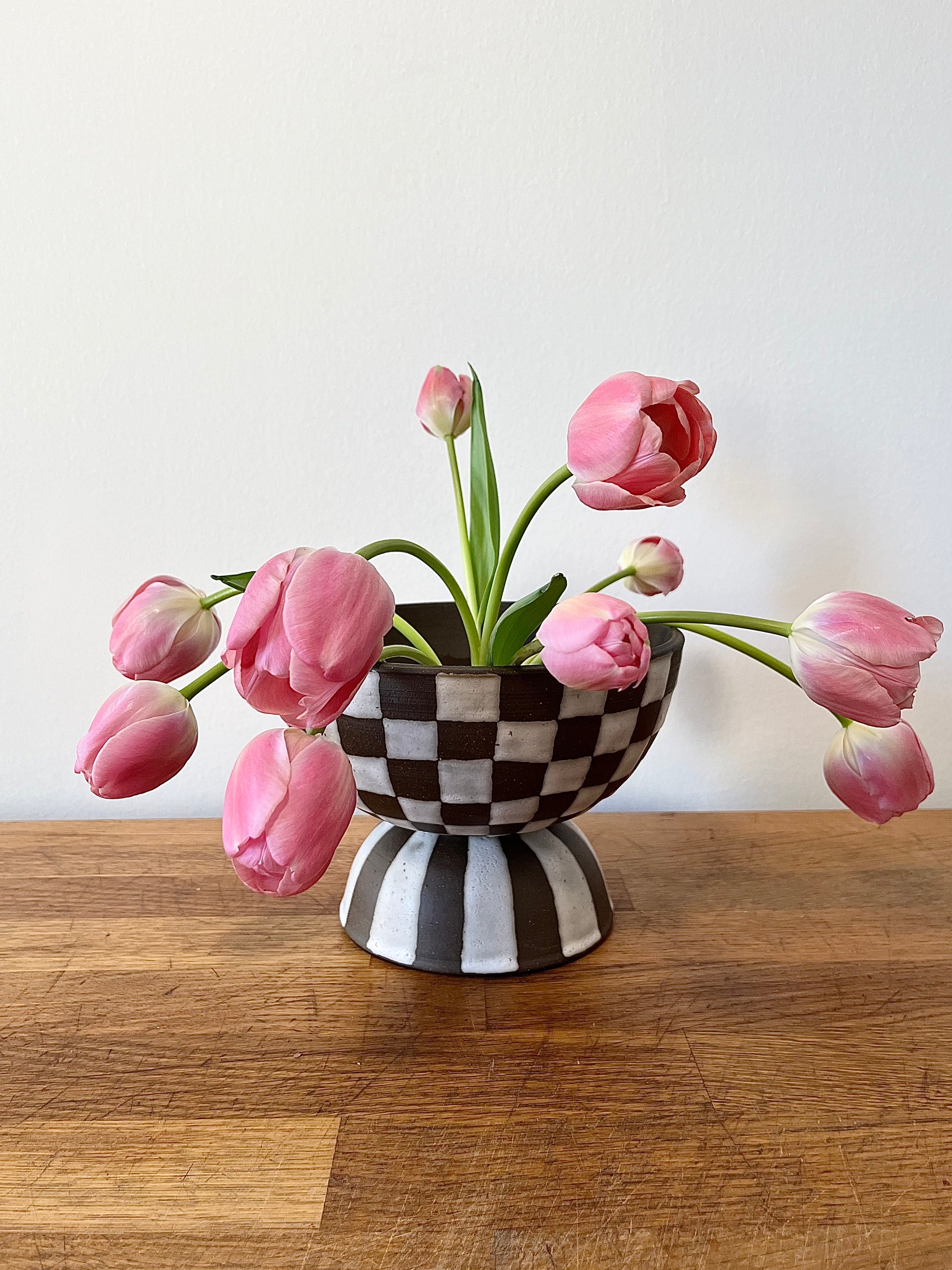 black stoneware compote vase with satin white glaze detailing. 7.5" diameter 5" height
